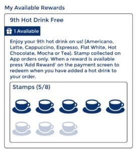 For every 8 hot drinks you order via the app, we'll give you your 9th for free! Check out your progress via the 'My Loyalty Card' page then select 'View My Balance'.
